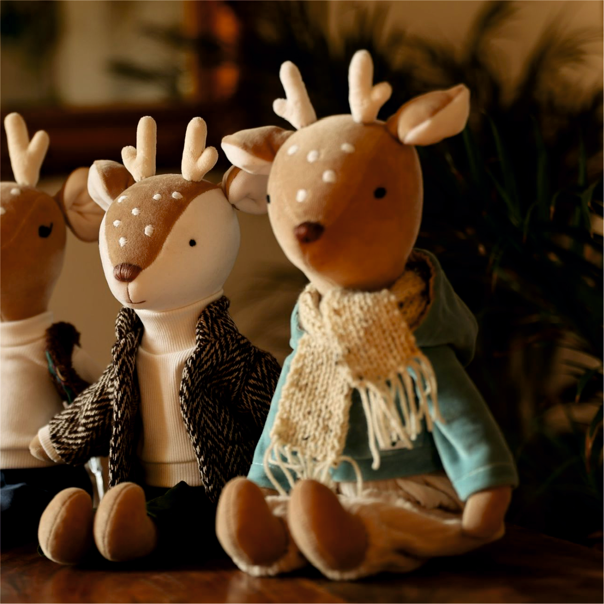 Jelonek w miękkiej turkusowej bluzie z kremowym, dzierganym szalikiem. Delikatne, pastelowe barwy, sympatyczny pyszczek i drobne białe plamki na głowie dodają mu wyjątkowego uroku.